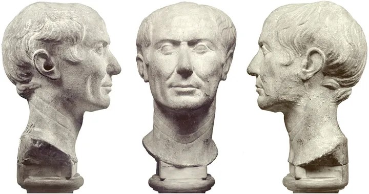 The marble bust above, discovered in the river Rhone, near Arles in southern France in 2007, is thought to have been carved during Caesars lifetime, so therefore is presumed to be a reasonable likeness. But no one’s really sure…