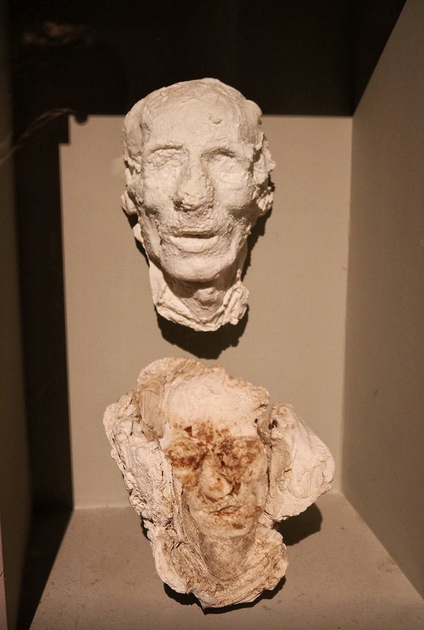 Although this unfortunate child’s mask was made inadvertantly, it shows how such masks became entwined with the funeral practices in ancient societies. Like the Greeks, the Romans believed in the soul and had a belief in the afterlife, therefore remembering the dead, either collectively or individually, was a duty of some sorts. The funerals of the elite were certainly well-crafted and stage managed affairs, and because these events were remembered by the citizens attending, hence the dead were being remembered, as if through their achievements and renown, they were still living. At Caesars funeral a wax effigy of the man was displayed complete with stab wounds and fake blood.