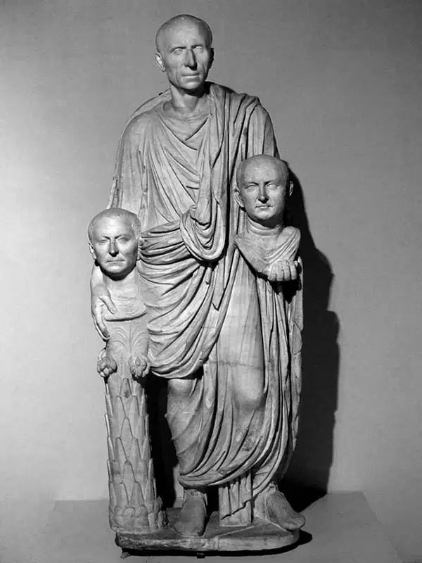 Togatus Barberini, Roman marble sculpture from the first-century AD, depicting a figure holding the heads of deceased ancestors in either hand. Housed in the Centrale Montemartini in Rome. Thought to be a representation of the Roman practice of creating death masks with which to honour the dead.