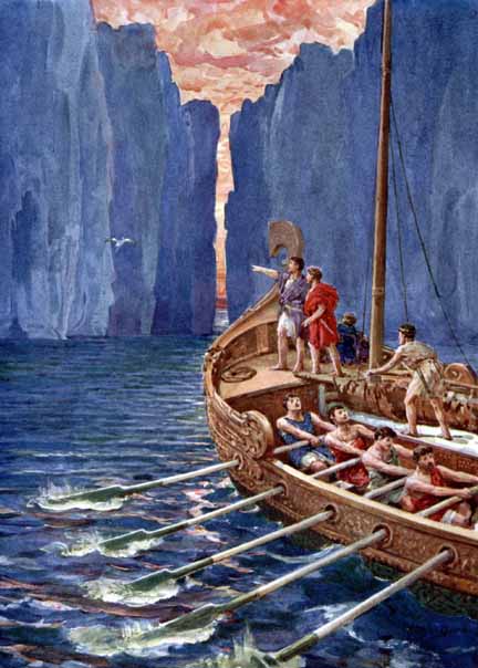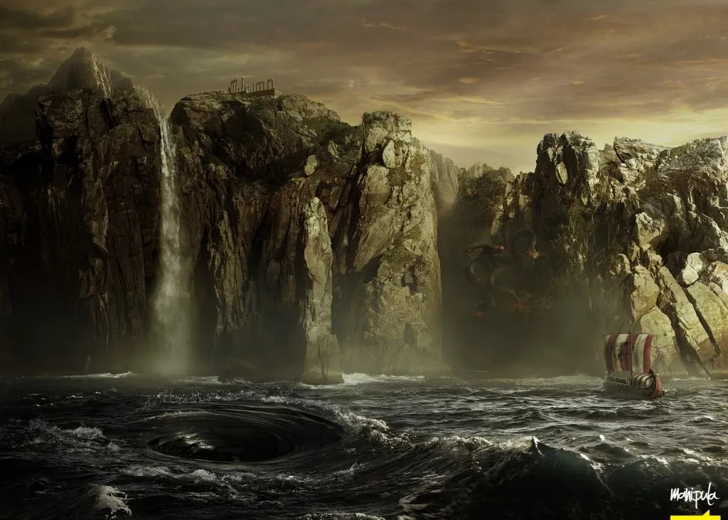 Just before they passed through the chasm, the sea monster Scylla that guarded the straits next to the whirlpool Charybdis, caught sight of the Argo attempting to traverse the gap and sought to destroy it. Jason though was being aided by Hera and Athena in his quest for the Golden Fleece, and they helped the Argo sail safely between the two dangers.